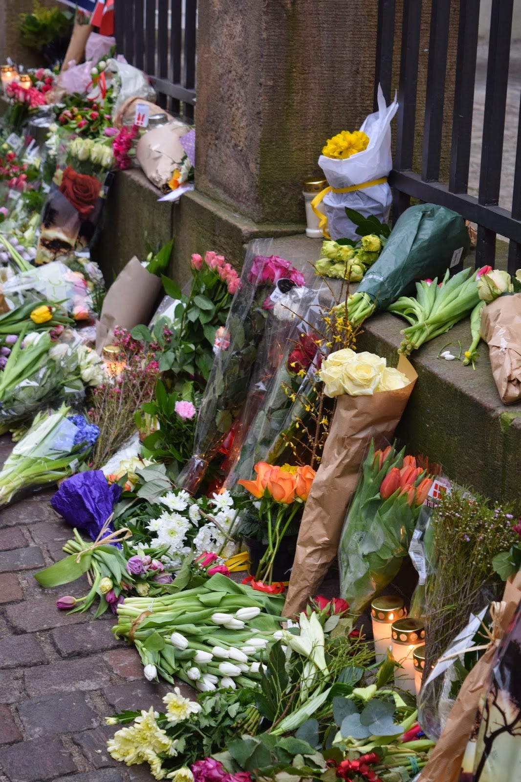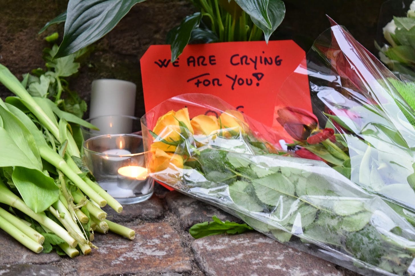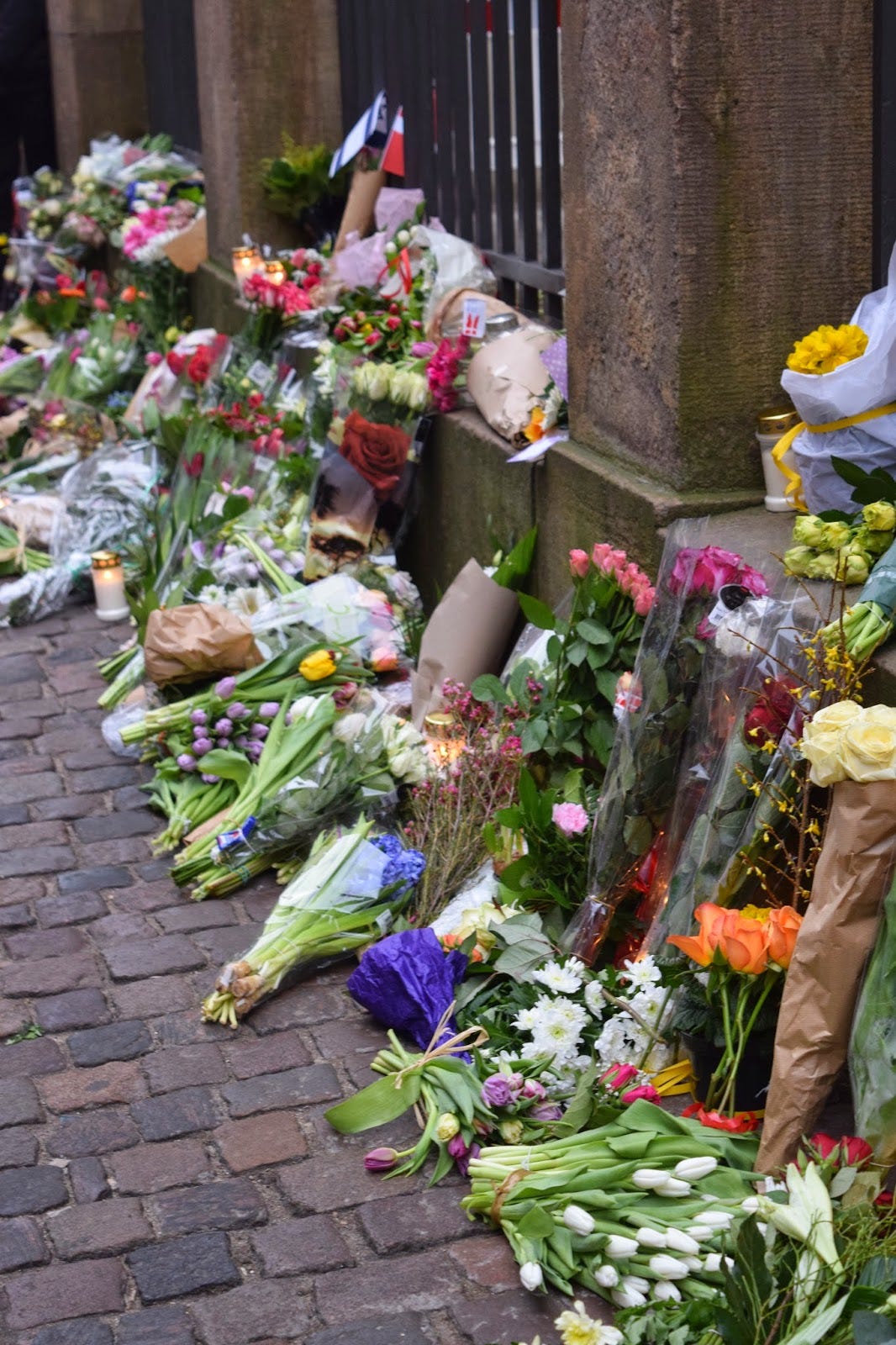 The day after the attack I kept finding myself leaving my apartment to walk over to the Synagogue; I went three times in one day. With each hour the piles of flowers, candles, and notes grew larger and larger. The sidewalk is still covered in flowers and candles, and more fresh bouquets are laid down each day. Each time I visit I weave in and out of the people in the crowd and the police who have been stationed there to protect the visitors and the city as a whole.