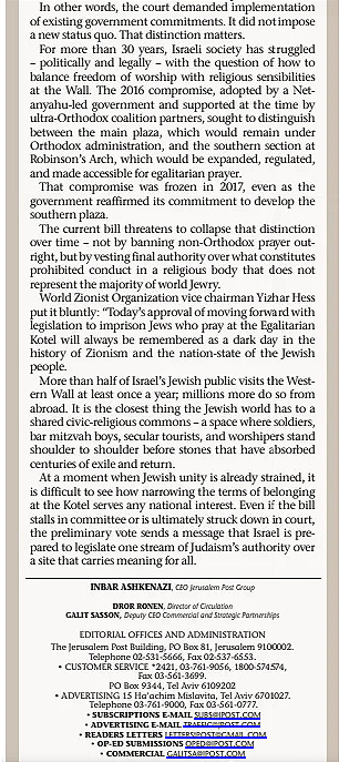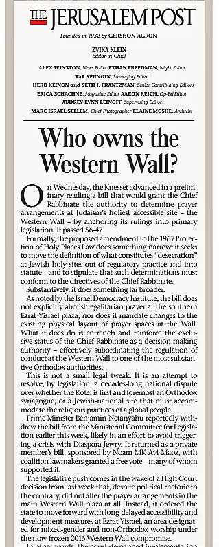See Times of Israel - https://www.timesofisrael.com/progressive-jews-sound-alarm-over-bill-cementing-orthodox-control-of-western-wall/ - Jewish Federations of North America: WHERE ARE YOU? See this editorial in Thursday’s Jerusalem Post. It’s a big deal.