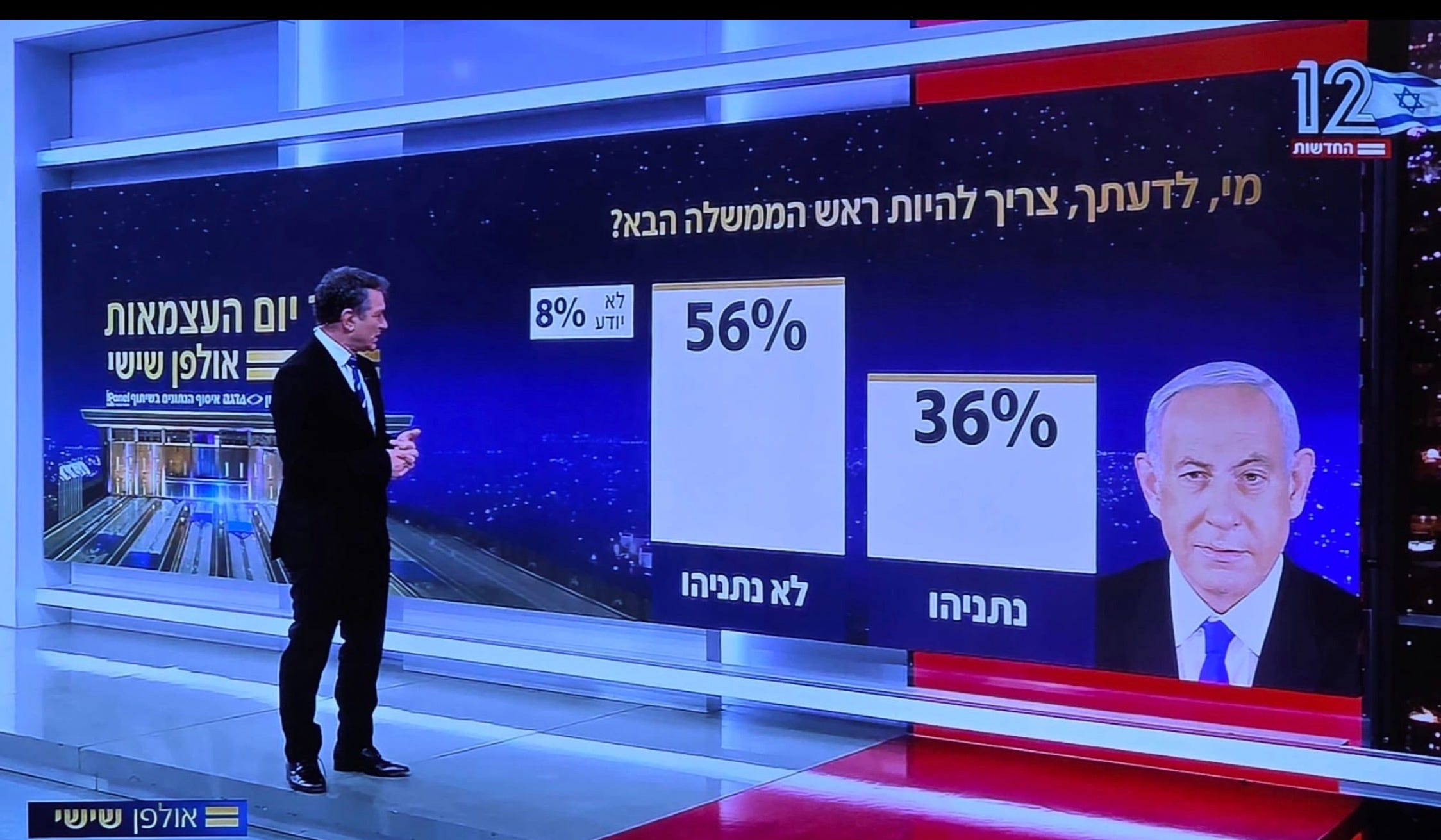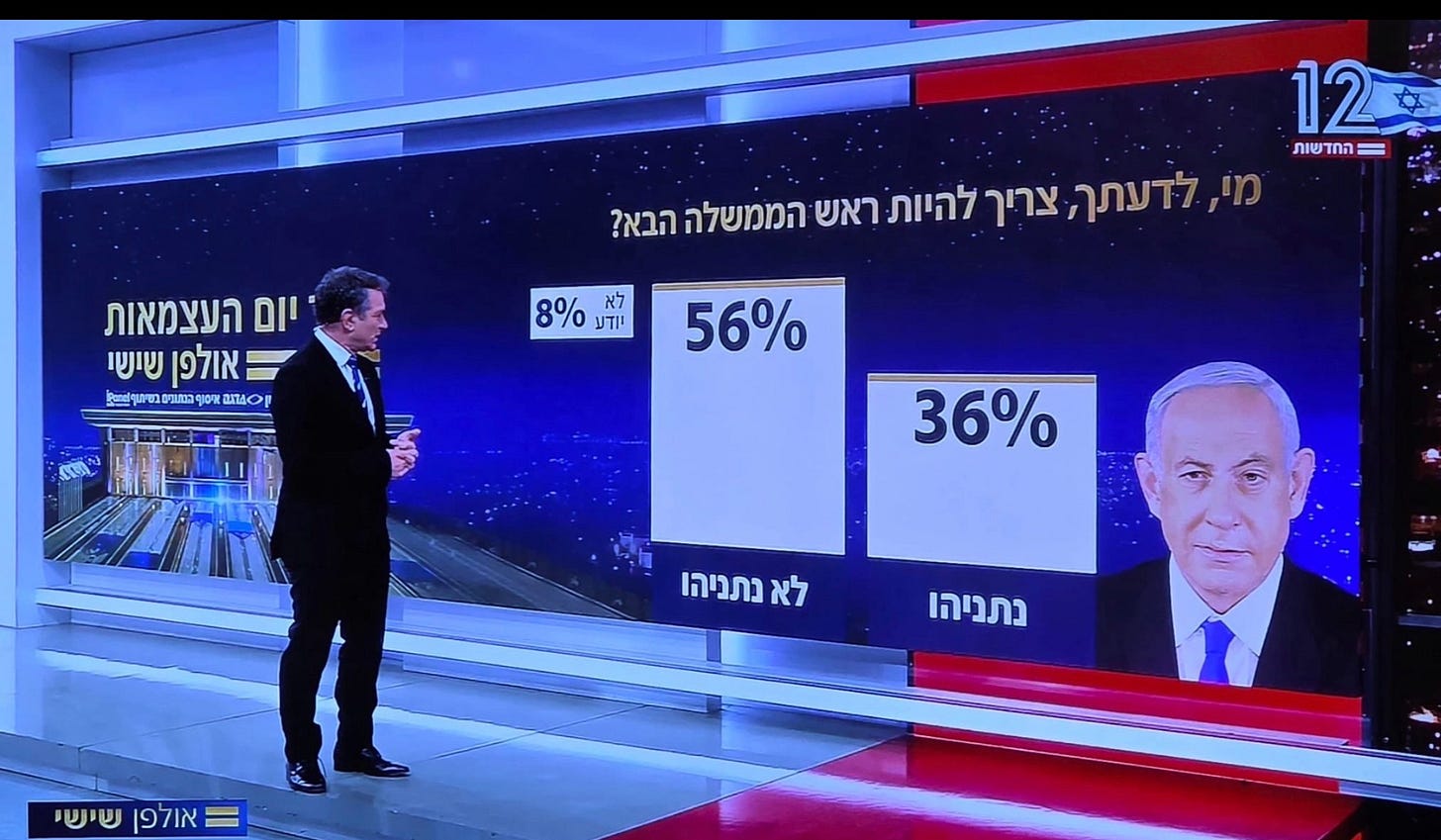 As of Friday, only 36 percent of Israelis prefer for Netanyahu to remain the country’s leader following this fall’s elections. Take a look at this screenshot from Israel’s top newscast, a response to the question, “Who in your opinion, needs to be the next prime minister?” You don’t need to read Hebrew to see where Netanyahu resides, whether you ae reading from right to left or left to right.