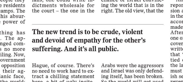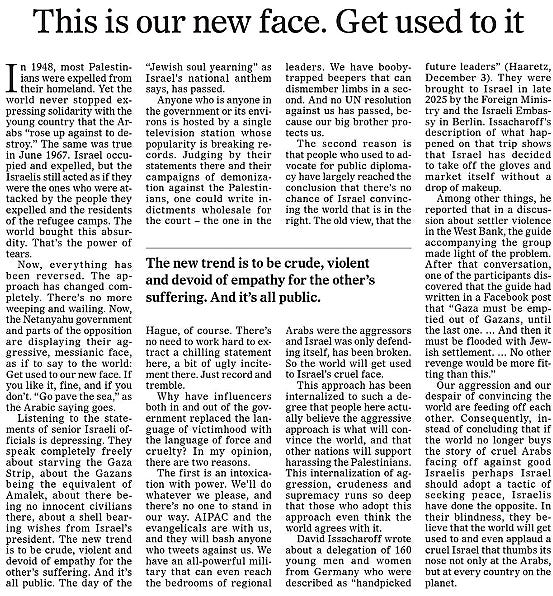 This approach has been internalized to such a degree that people here actually believe the aggressive approach is what will convince the world, and that other nations will support harassing the Palestinians. This internalization of aggression, crudeness and supremacy runs so deep that those who adopt this approach even think the world agrees with it.”