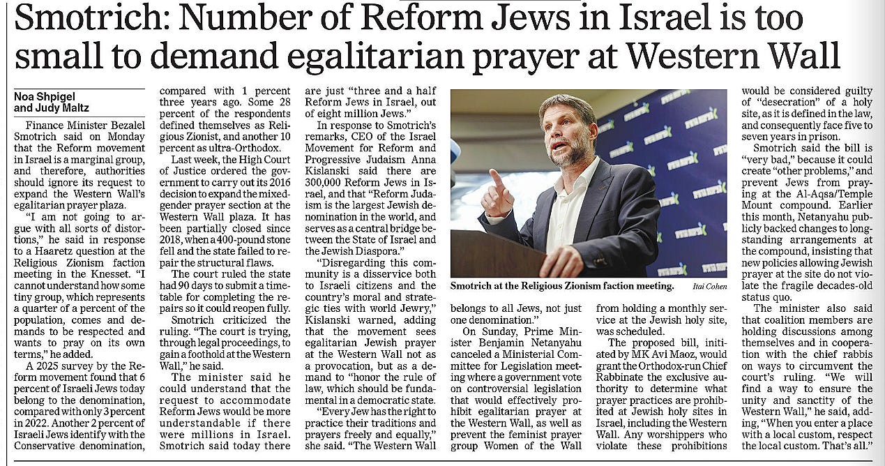 The courts gave Netanyahu’s government an easy offramp, but much like the Trump administration’s doubling down on its cruel immigration policies every time the courts slap them down, Israel’s worst-of-the-worst Finance Minister took a few minutes off from trying to annex the West Bank to stick his thumb in the eye of the majority of American Jews, saying "I cannot understand how some tiny group, which weighs a quarter of a percent of the population, comes and demands to be respected and wants to pray on its own terms.”