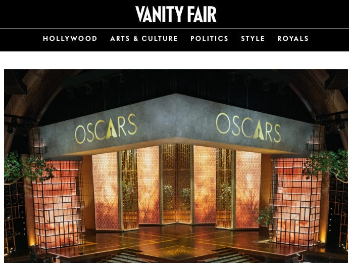 Vanity Fair has shared a sneak peek at the stage design for Sunday evening’s Oscars, revealing a stage featuring “scattered trees and a more organic feel to create a calming space in a chaotic world.”