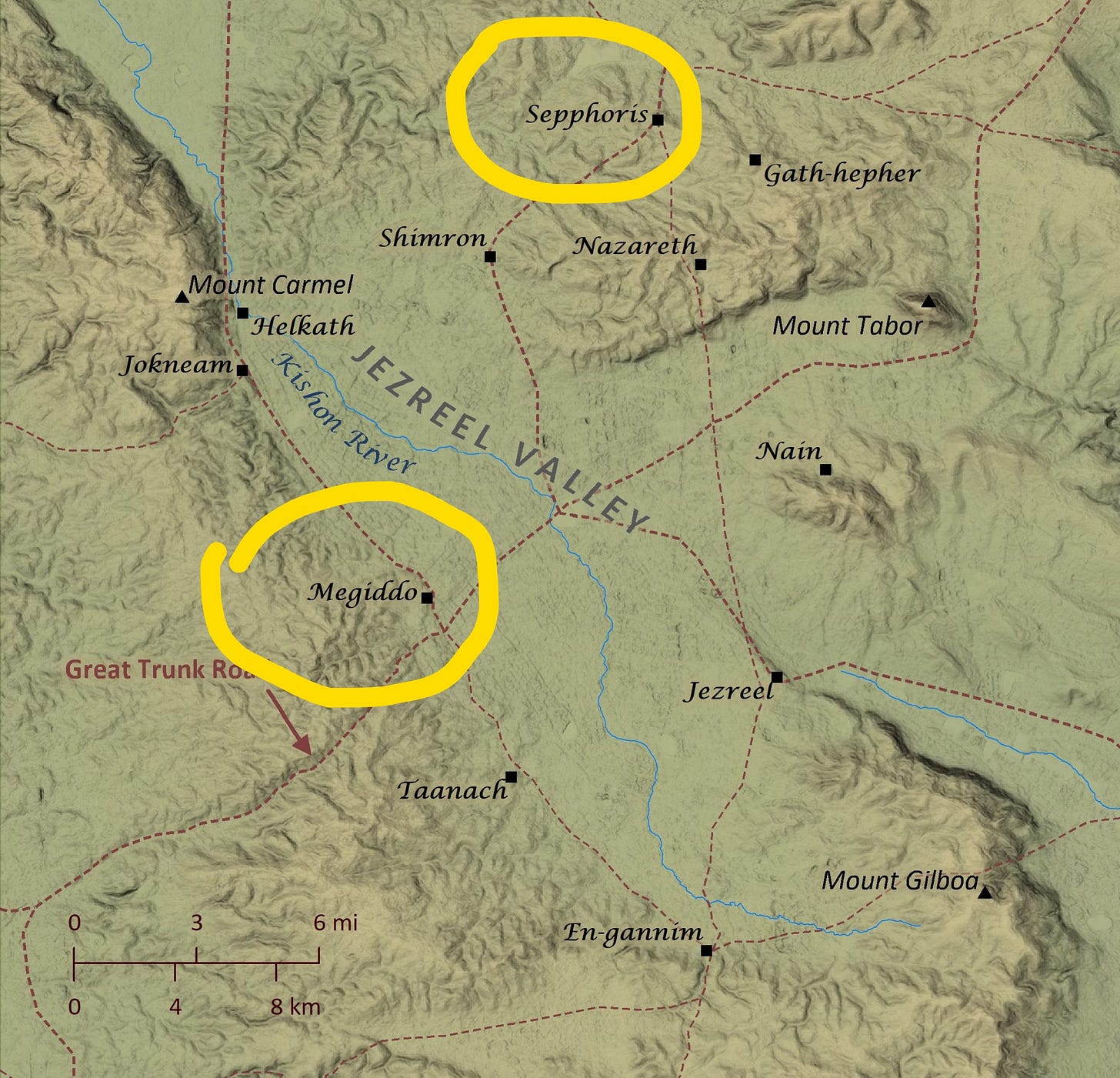 It’s 33 minutes from Megiddo to Tzippori by car, seven hours on foot, maybe an hour as the tzipor flies. It was a quick three hour walk for Jesus from Nazareth, and I’ll bet he went up there for some carpentry jobs in the pricy villas.