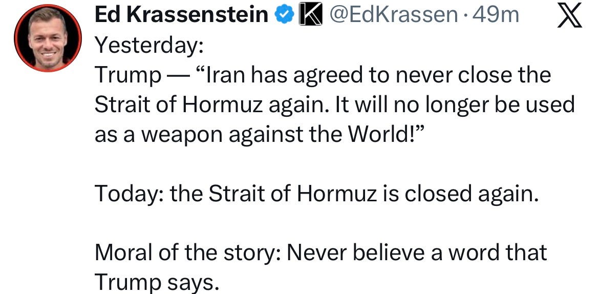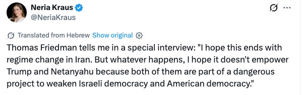We see Trump’s “approval” rating falling to the mid 30s recently. Meanwhile, most in Israel have supported the war in Iran, which, although I feel it’s shortsighted and ridiculously dependent on the word of the world’s two greatest liars, I can understand it, given the Iranian threats of annihilation and such. But most Israelis have now come to understand three things. 1) Trump is never to be taken at his word4 and 2) Bibi is just as bad, and 3) as Thomas Friedman told an Israeli journalist this weekend: