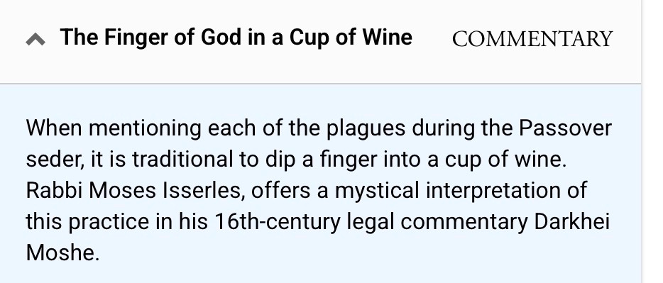 Perhaps the drip-drip-drip of wine/plagues could be an instrument of revenge on enemies other than Pharaoh. Or an imitation - or parody - of Greek and Roman practice of pouring a libation to the gods before drinking wine at a symposium. Or a mystical way of discerning God’s active role (God’s finger) in salvation history.1