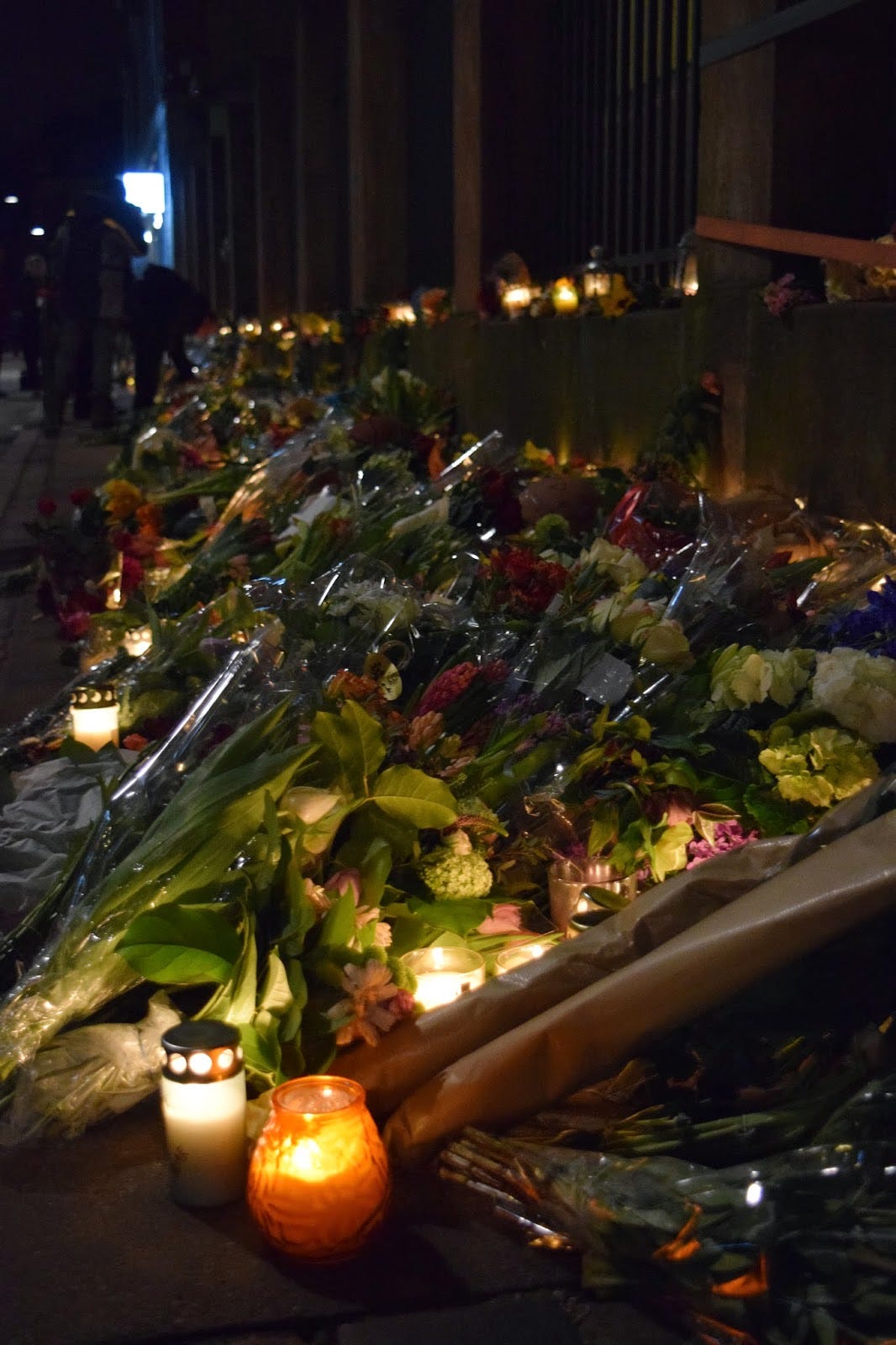 The day after the attack I kept finding myself leaving my apartment to walk over to the Synagogue; I went three times in one day. With each hour the piles of flowers, candles, and notes grew larger and larger. The sidewalk is still covered in flowers and candles, and more fresh bouquets are laid down each day. Each time I visit I weave in and out of the people in the crowd and the police who have been stationed there to protect the visitors and the city as a whole.