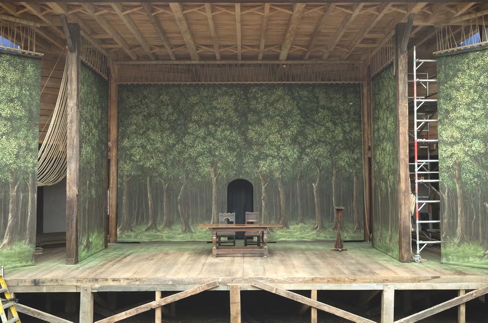That same forest imagery comes back into play later on, as the cloth backdrop for the production of Hamlet at the film’s recreation of the Globe Theater.