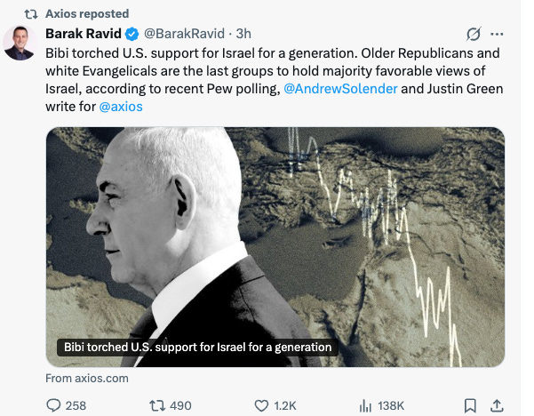 Now, for American Jews and many others, there is outright despair over the precipitous fall from grace Israel has taken in American public opinion. In normal times, this would be a cause for emergency action, and some action is warranted. But that action should not be for Israel supporters to rally around this Netanyahu government that has caused such harm to Israel’s fragile, hard-earned reputation for humanity and resilience. That harm is significant5 as journalist Barak Ravid indicated in this posting on X: