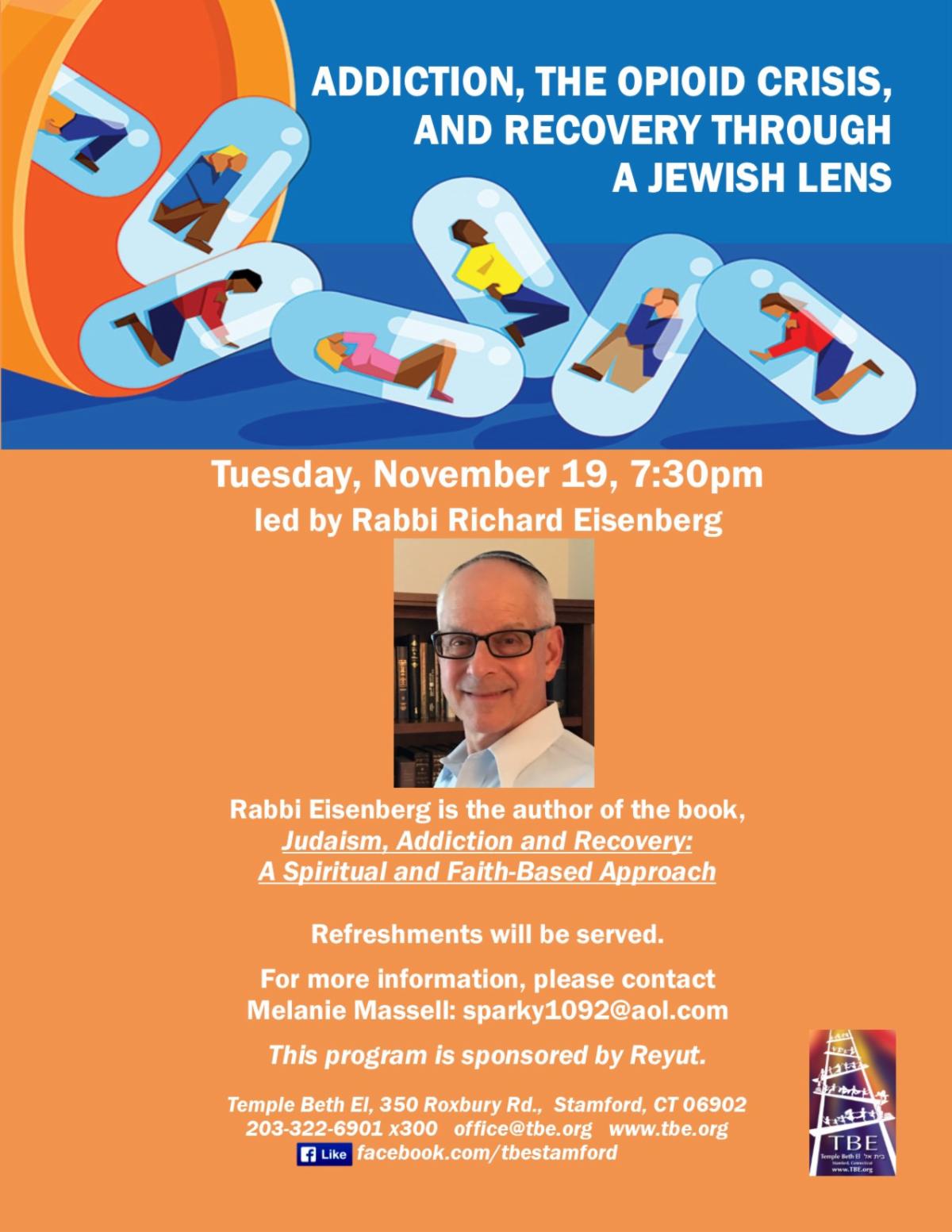 Mazal Tov to Jonah Rosenberg and family as he becomes Bar Mitzvah this Shabbat morning. Get a sneak preview of our weekly portion of Vayera's study packet. Tonight I'll be joined at services by Cantorial Soloist Katie Kaplan and Koby Hayon, Musical Guest. (And don't forget to save the date for next Friday's Shabbat Unplugged with the return of Cantor Deborah Jacobson!) Also, see last week's commentary on Lech Lecha by Bat Mitzvah Lana Busch. At the bottom of this email, see a flyer for a very important presentation to be held here next Tuesday, by Rabbi Rick Eisenberg, on Jewish approaches to the opioid crisis.