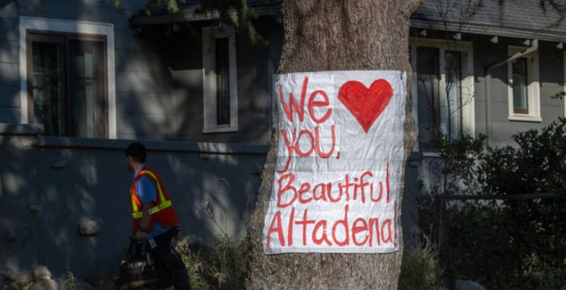 Elsewhere in Altadena, signs of renewed life strained to break through along with defiant indicators of concern that greedy moguls will try to grab vacated parcels at rock bottom prices.