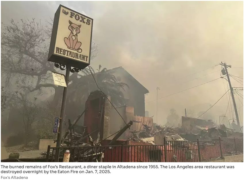 Animals in their habitats suffered perhaps even more than people in the Eaton fire. We’ll never know how many lost their homes and loved ones due to a climate catastrophe that they did not cause. Unlike in ancient Jerusalem, there are few foxes in Altadena - though one of the casualties of the flames was Fox’s, a local eatery for decades that will sadly not reopen.