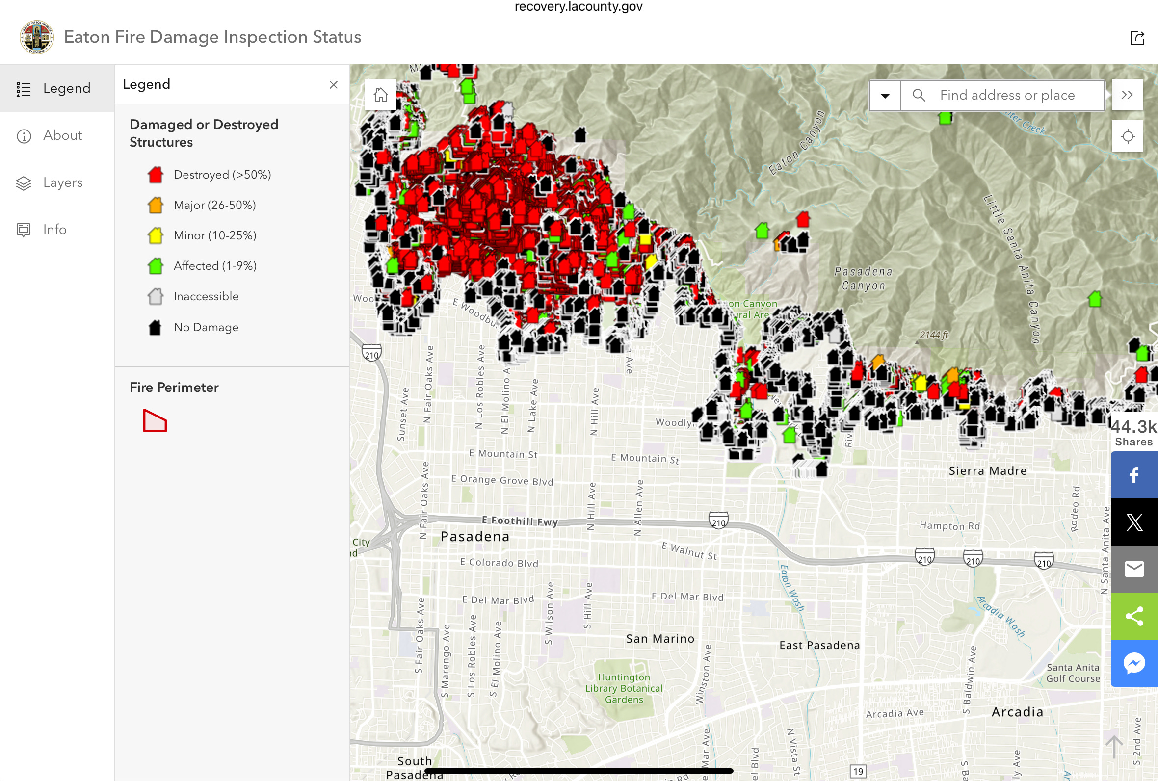 Read more about the Eaton fire here. According to Wikipedia, as of July 22, 2025, the death toll from the Eaton Fire included 19 people with 22 people missing. All but 1 of the 19 victims confirmed dead lived west of Lake Avenue, the predominately black neighborhood in Altadena that received emergency evacuation orders hours after those in east Altadena.
