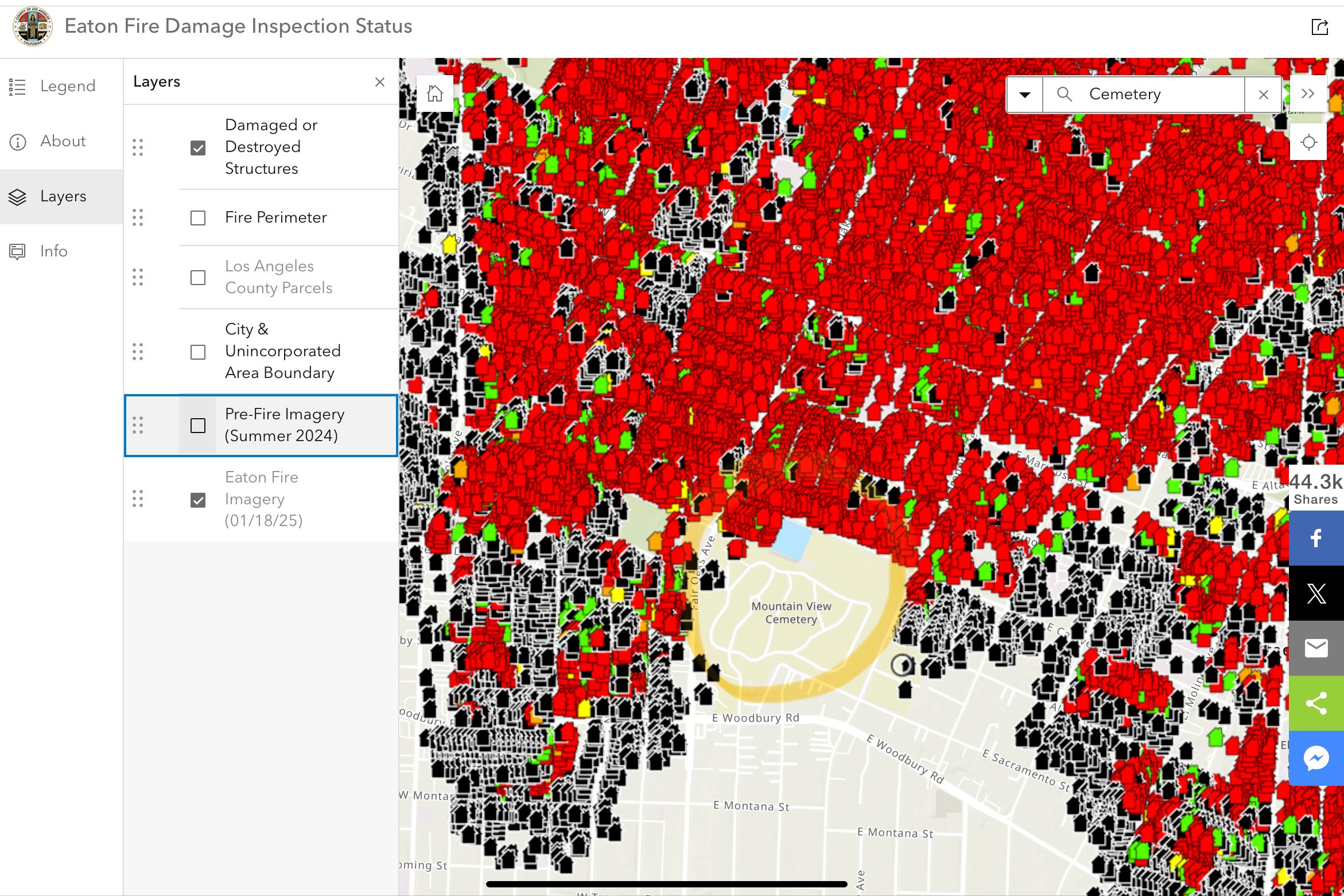 Notice where the area of greatest destruction, marked in red, abruptly stops. It’s at the Mountain View Cemetery, which I passed, and, with some prompting from my guide, immediately I could see the dramatic shift from utter destruction to entire blocks completely undamaged. Without the cemetery to block it, the Eaton fire could easily have continued its rampage southward to Pasadena.1