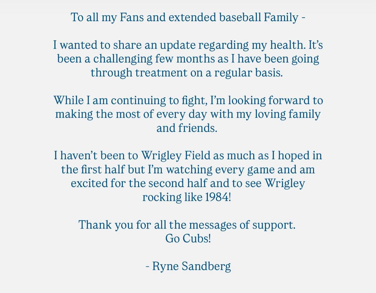 Ryne Sandberg was told he had licked it, that he was “cancer-free.” This larger-than-life baseball hero to a generation was going to make it. We know the Grim Reaper is batting 1,000, but Sandberg was going to brush him back with a high hard one.