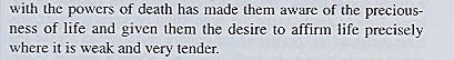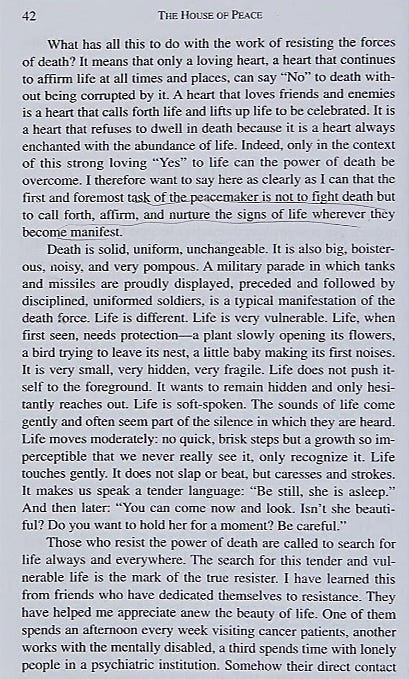 Only a loving heart, a heart that continues to affirm the life at all times and places, can say “No” to death without being corrupted by it…the first and foremost task of the peacemaker is not to fight death but to call forth, affirm, and nurture the signs of life wherever they become manifest. (Road to Peace, p.42)