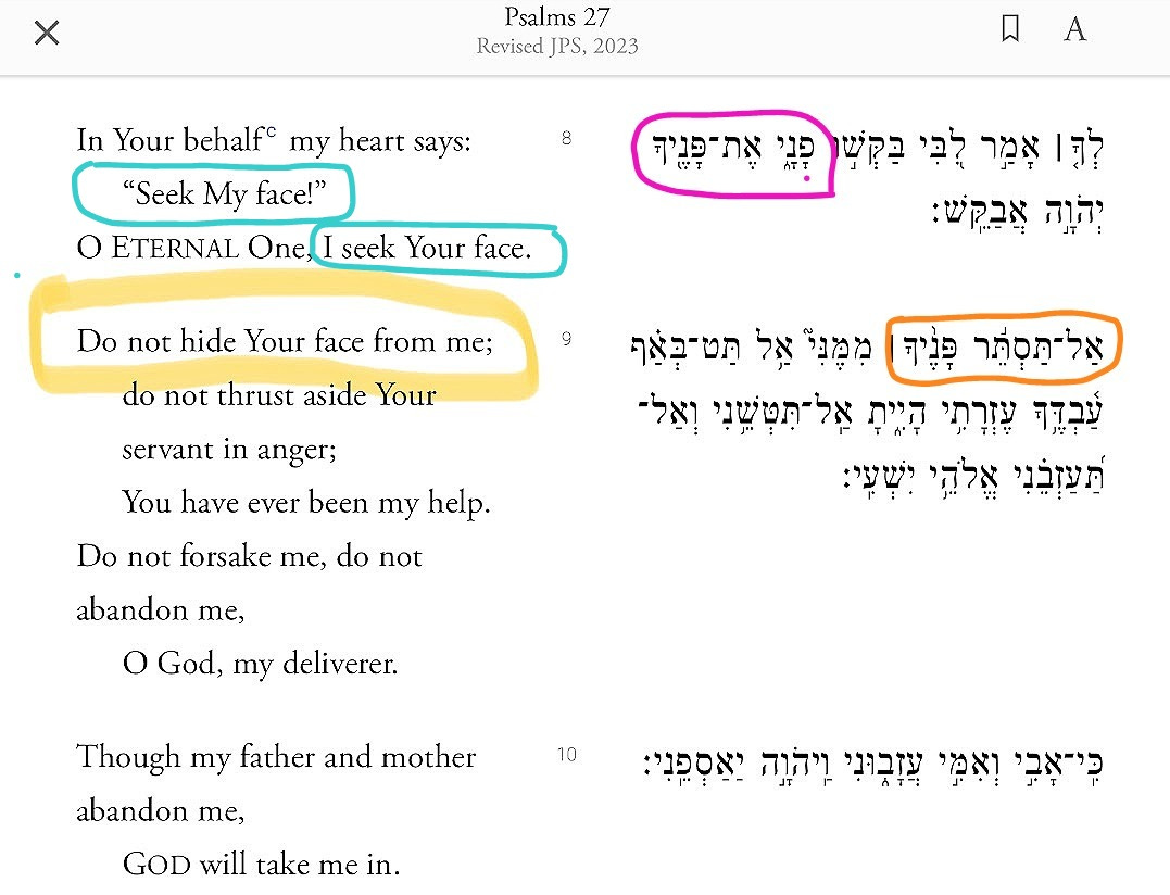 In the Hebrew, the tone of this plea approaches desperation - the word “face” is repeated three times in three lines. The psalmist thirsts to see God’s face, or at least to spend his life’s journey seeking it. “My face desires Your face,” the psalmist says. It’s the world’s first invitation to FaceTime.
