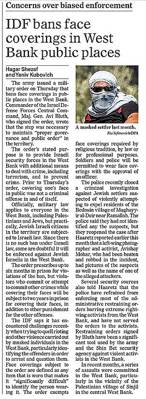 Something similar appeared in Ha’aretz, an Israeli newspaper. It seems that in the West Bank, people who are up to no good, whether Hamas operatives or extremist settlers, tend to cover up with masks.