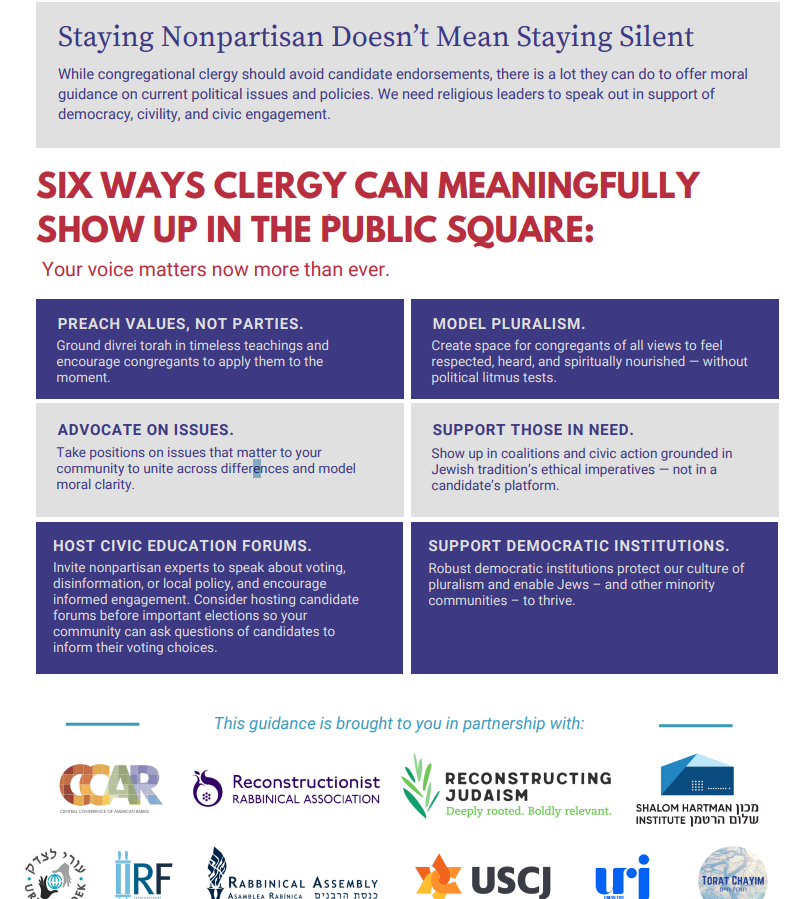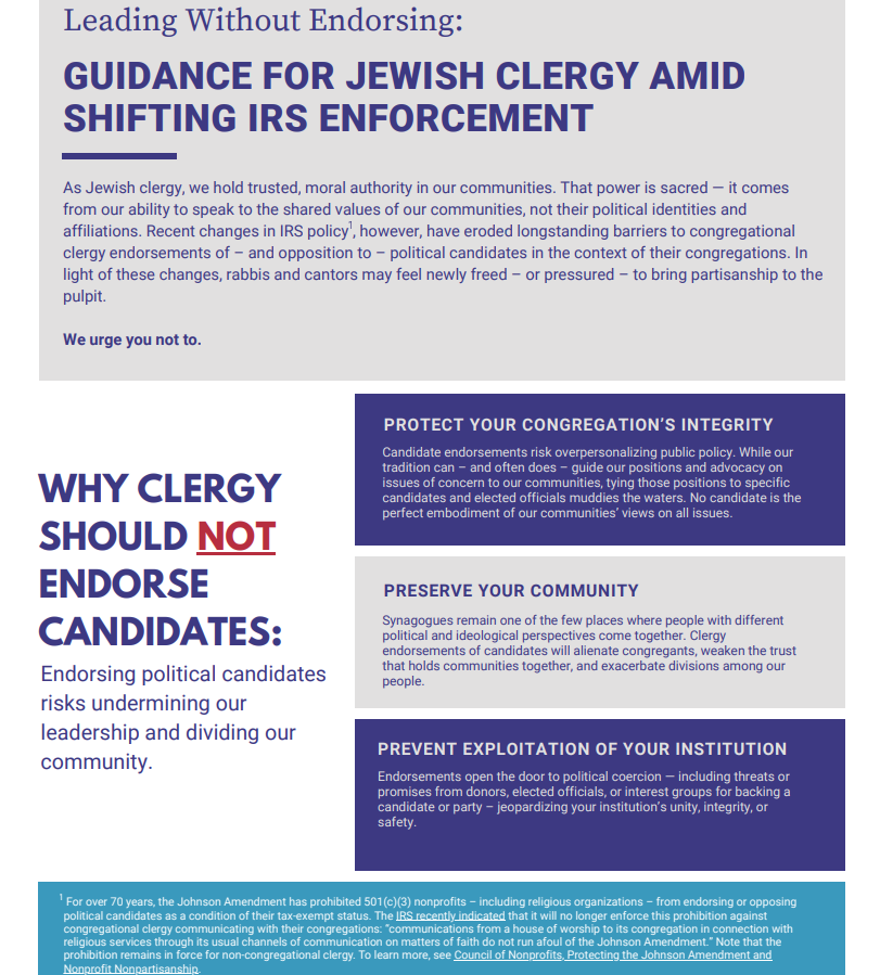 Organized by A Perfect Union: The Jewish Partnership for Democracy,3 progressive Jewish organizations have circulated to rabbis a collection of guidelines entitled “Leading without Endorsing,” listing a number of reasons rabbis should pretend that the Johnson Amendment is still in force.