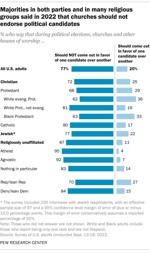 And it’s a move opposed by most Americans. See In a 2022 survey, most Americans opposed churches endorsing political candidates (Pew)