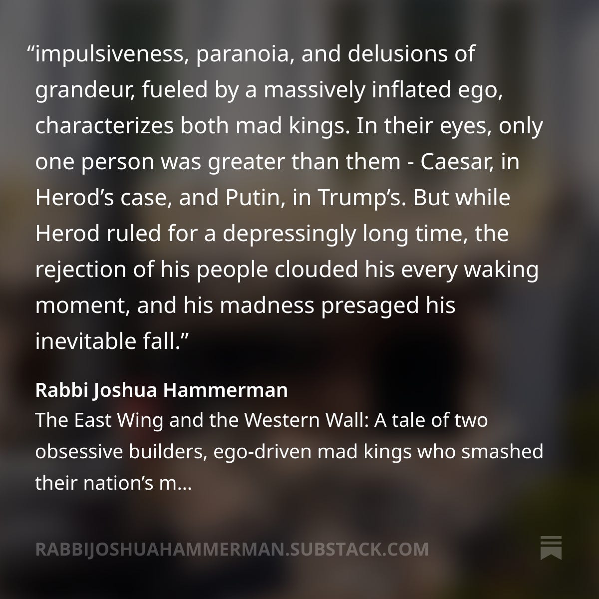 We’ve seen this before. An obsessive builder, paranoid, impulsive, thirsting for adoration but universally despised, wanting to make his nation great again. What can be learned from Herod’s madness?