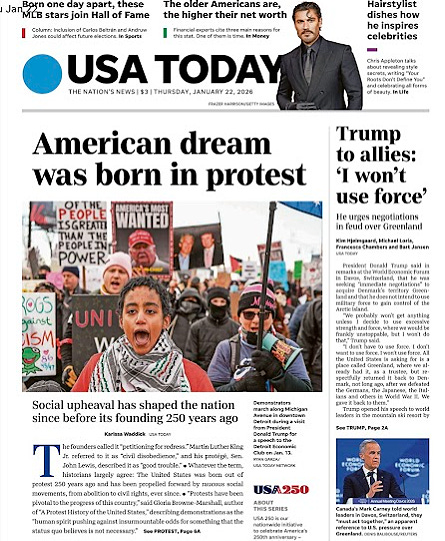 January 21: In Davos, Switzerland, hundreds of people protested Trump at the World Economic Forum, with some burning American flags in protest.[926] In Las Vegas, students walked out of classes in anti-ICE protests.[927]