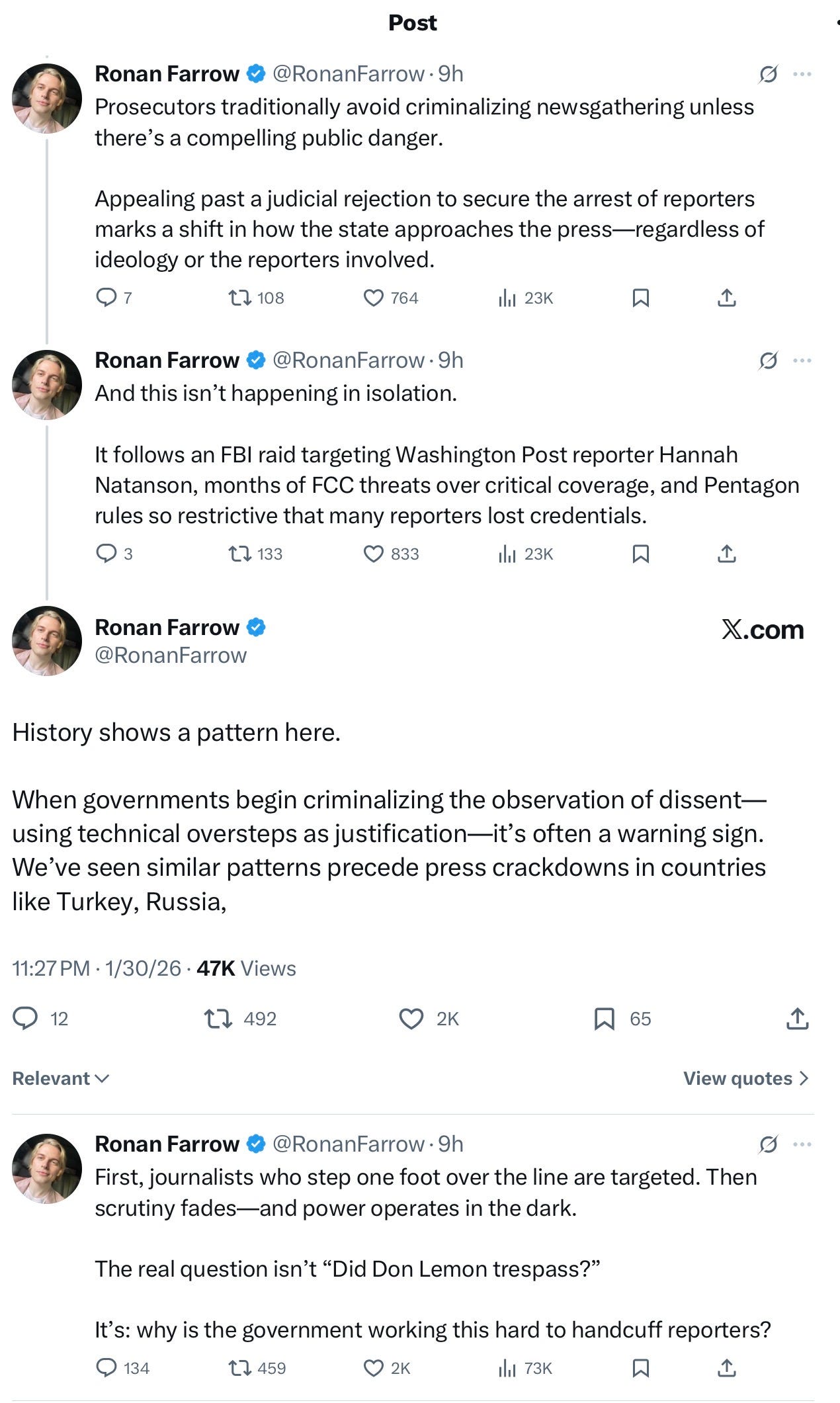 As a religious leader, I can tell you that what Lemon did was NOT an attack on freedom of religion, which I also cherish. Whether or not you consider the interruption of a religious service unconstitutional, which I don’t (though it is rude, and it’s nice to know that the government thinks I can have arrested the congregants who stood up and interrupted me mid-sermon to object to some comments I made about Israel two years ago), Lemon stated clearly on the video that he was covering the event as a journalist. It is the attempt to arrest him for recording the protest that is unconstitutional - and unconscionable. As Ronan Farrow posted on X: 1