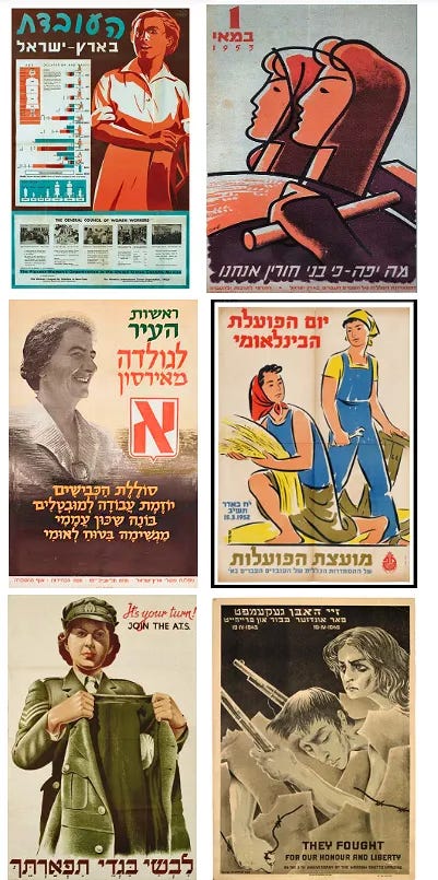 Look at the posters above and you’ll see a proud pioneer, a worker, an army recruiter, a Warsaw Ghetto fighter. None of them could have made the secretarial pool on Mad Men. While Americans were watching “And God Created Woman” and dreaming of Brigitte Bardot, and while Rat Pack dudes fondled and were objectifying their dames, Israel was enlisting and electing theirs.