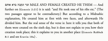 Interestingly, Genesis 1:27 indicates that male and female were created simultaneously, perhaps even androgynously, which would have made it very hard for them to use a bathroom in a number of states. Commentators have tried to reconcile this depiction with a second version of the story in Genesis 2, where Eve is created out of Adam’s side (“rib” is a mistranslation), which again could have indicated an androgynous origin, or perhaps the world’s first conjoined twins.7 But in this account Eve goes on to take a role of subservience to Adam (Gen. 3:16) as her punishment for that little fruit-eating, snake-inspired caper.