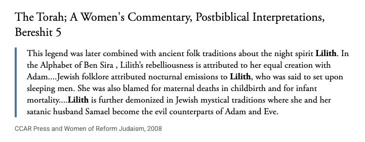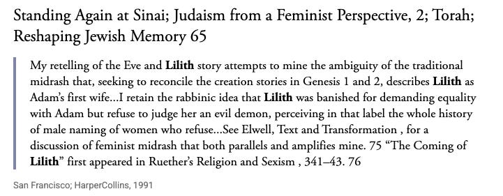 See a large collection of sources here8 and see Judith Plaskow’s modern midrash based on the ancient formulations, The Coming of Lilith.