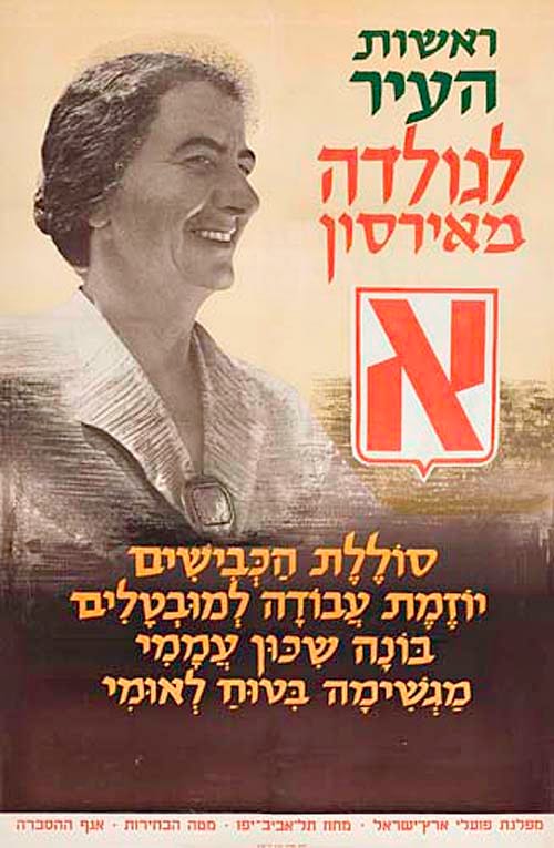 Here’s a young Golda Meir, then still called Myerson, in a mayoral race, at around the same time that, in America, June Cleaver was bringing Ward his slippers and serving Brussel sprouts to the ‘Beve.